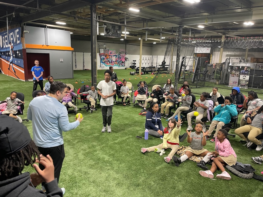 Learning through play! Kids gather for an interactive session focused on teamwork and skill-building at the indoor training facility.