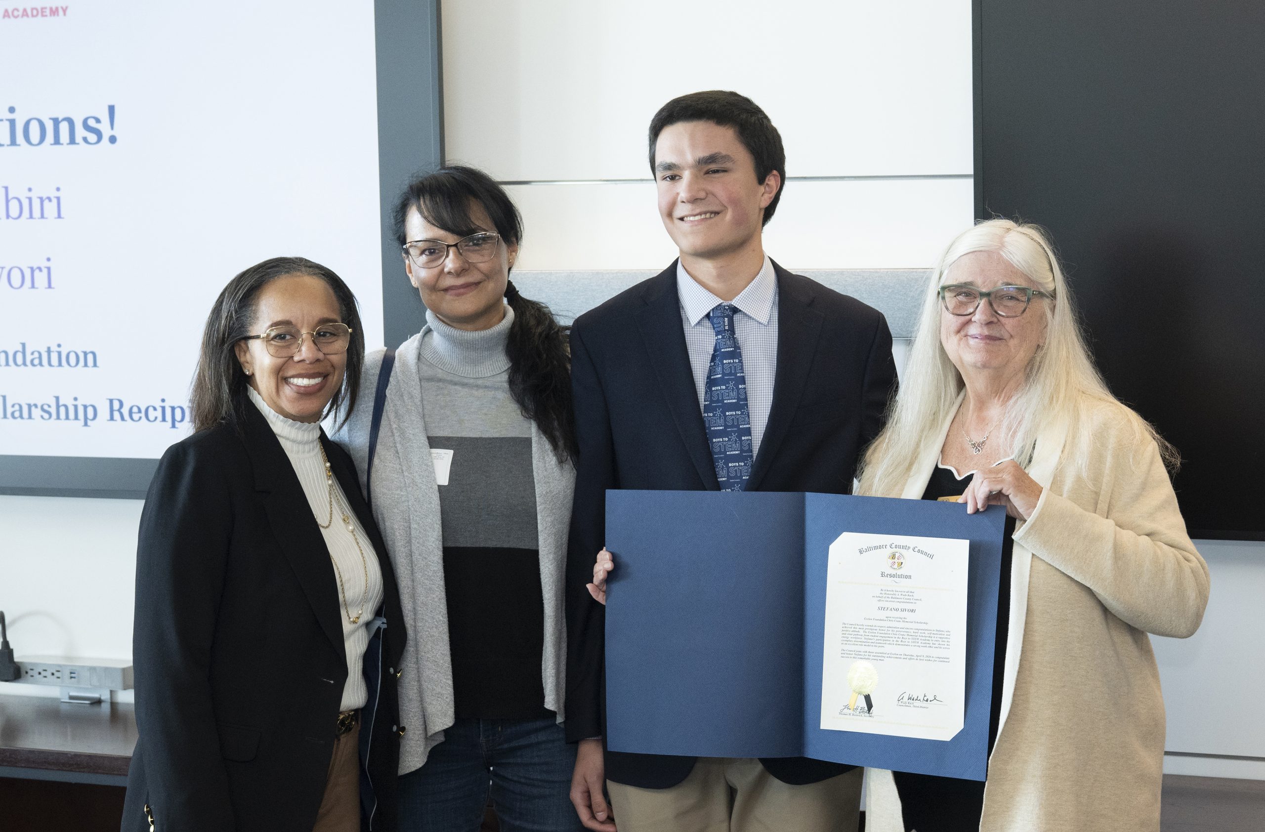 Stefano Sivori poses with his mother, Legislative Aide to Baltimore County Councilman Wade Kach C. Lynne Jones, and BGE President and CEO Tamla Olivier.